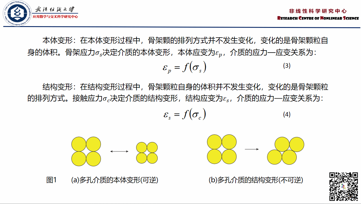 徐静蕾:本次组会介绍了双重有效应力。有效应力是多孔介质力学的基础概念,固体力学的理论通过有效应力应用于多孔介质,产生了多孔介质力学。双重有效应力是在介质变形机制基础上提出的有效应力概念。 多孔介质存在两种基本的变形机制:本体变形和结构变形。与此相对应,多孔介质存在两个有效应力:本体有效应力和结构有效应力。本体有效应力决定多孔介质的本体变形,结构有效应力决定多孔介质的结构变形。双重有效应力考虑了多孔介质的物质结构,引入了多孔介质的物性参数,参数取不同的数值,可用于不同的介质类型。
