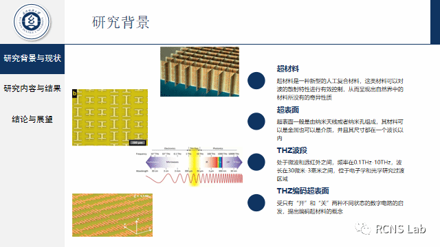 陈戈:介绍了THz波段、超材料、超表面、编码超表面的概念与特性,简单陈述了THz波段的几个应用方向,简要讲解了圆极化波和PB相位理论的知识,提出了两个工作,分别为一种基于PB相位的低窜扰通信的双频透射编码超表面和一种基于PB相位双频反射超表面,展示了所设计的双频编码超表面对比与传统编码超表面的优势,陈述了优化双频编码超表面各个参数使得串扰降低,并使其在各自工作频段拥有良好的工作状态,分别展望了所设计的双频透射编码超表面在THz多信道通信的巨大潜力和双频反射编码超表面在未来THz雷达反隐和超高速通信的良好应用前景。