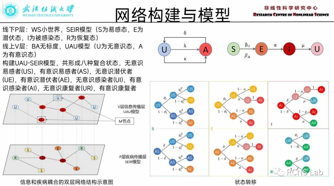 李沁雅:本次汇报了近期的工作成果,首先汇报了《时空关联性微博热搜舆情扩散特征对比——以对社会属性互异的三对关联热搜分析为例》的网络建模和得到的网络数字特征,用来探索不同社会属性的微博热搜舆情是如何进行传播的;然后介绍了目前在做的工作,建立了UAU-SEIR线上线下双层耦合网络,并且在线上设置固定节点实现单向连边,按照不同的选择模式来探索这些节点对疾病传播的影响。