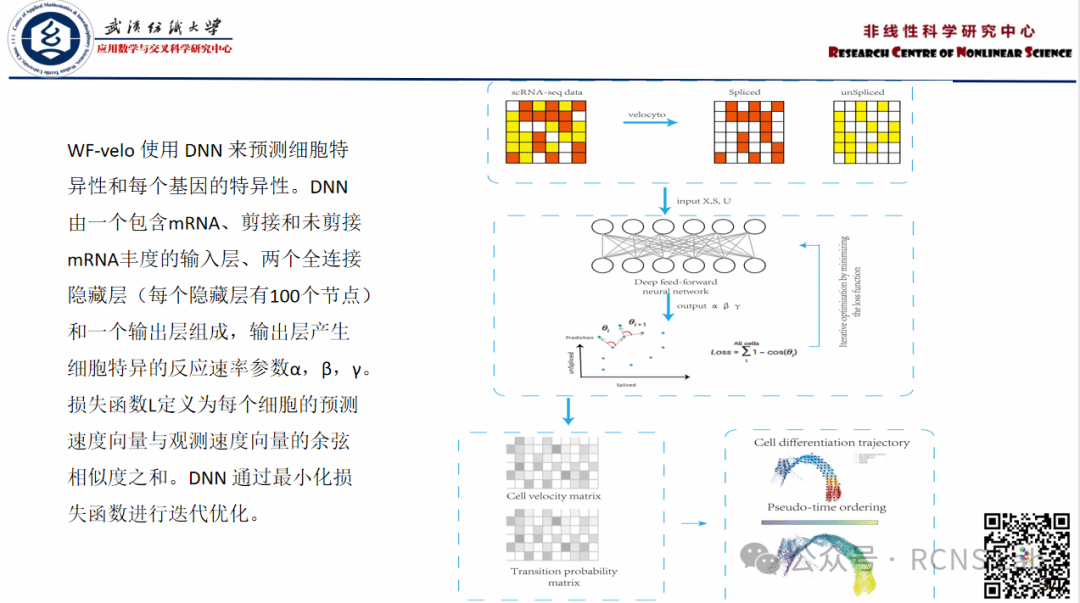 李成:本次汇报了毕业论文的研究内容。为了能够解决缓解估计定量未剪接mRNA和剪接mRNA丰度对估计RNA速度的影响,并且不需要复杂的额外的特征信息来增强RNA速度的估计,我们改进了RNA速度模型,设计一个新的RNA速度模型WF-velo,具有简单并能提高单细胞测序数据的利用率,用完整的细胞基因表达特征信息来估计RNA速度,并推断细胞分化轨迹。