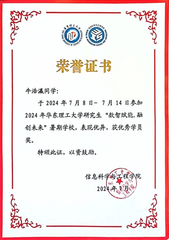 研学交流|我院牛浩瀛同学赴华东理工大学参加“数智赋能. 融创未来”研究生暑期学校