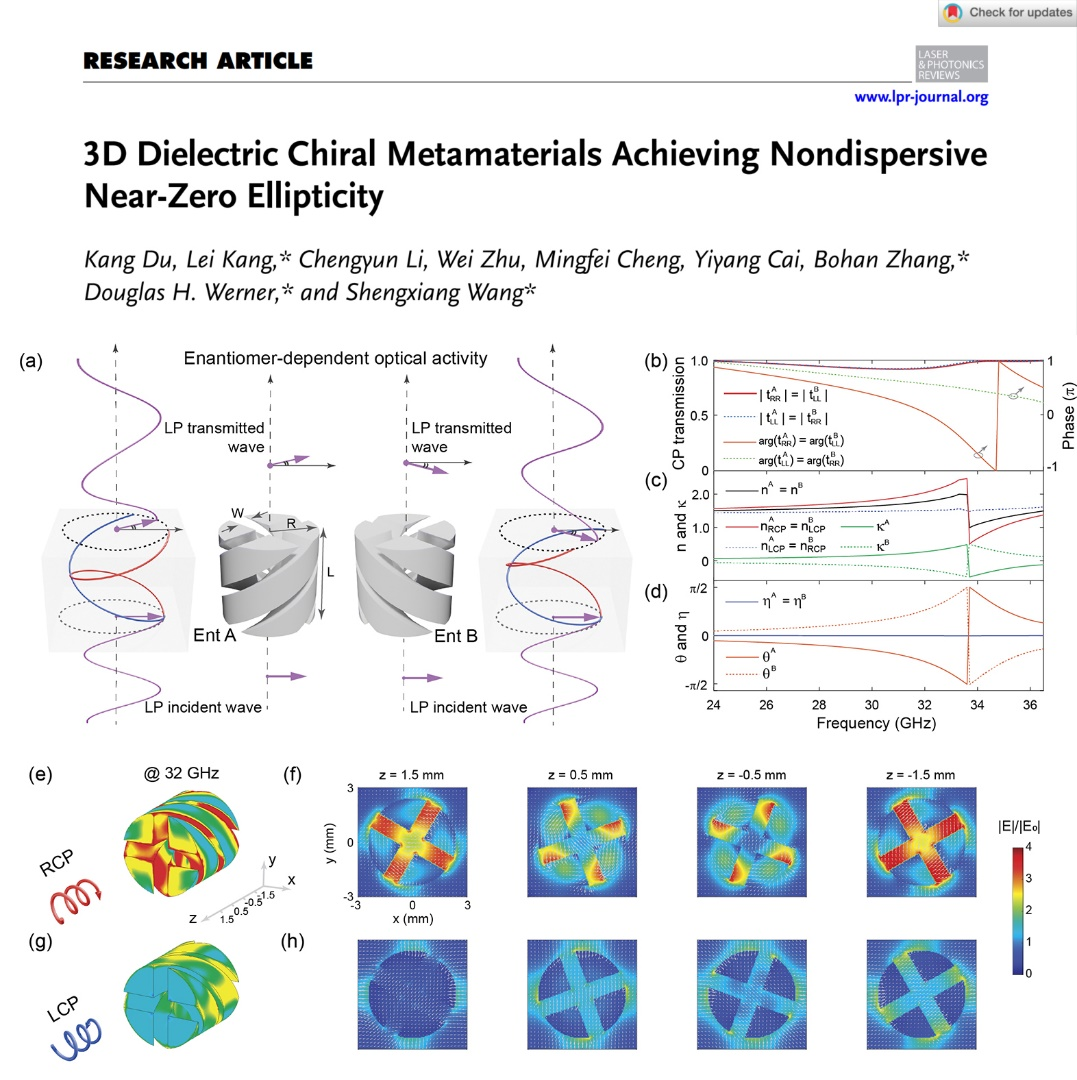 汪胜祥教授团队在国际著名光学期刊“Laser & Photonics Reviews”上发表了题为“3D Dielectric Chiral Metamaterials Achieving Nondispersive Near-Zero Ellipticity”的高水平研究性论。该研究工作展示了一种基于光固化3D打印工艺制备的复杂手性螺旋三维(3D)超材料。该超材料在毫米波频段实现了宽频带、非色散的近零椭圆率,对左旋圆偏振(LCP)和右旋圆偏振(RCP)入射电磁波表现出近乎相同的共极化透射强度及显著的相位延迟差异。利用先进三维制造技术实现具有复杂参数空间的三维超原子,有望成为设计与制备多功能精密超材料的新范式。该论文的第一作者为汪胜祥教授团队的杜康副教授,武汉纺织大学张博涵博士与汪胜祥教授为本论文的共同通讯作者,武汉纺织大学为第一单位。