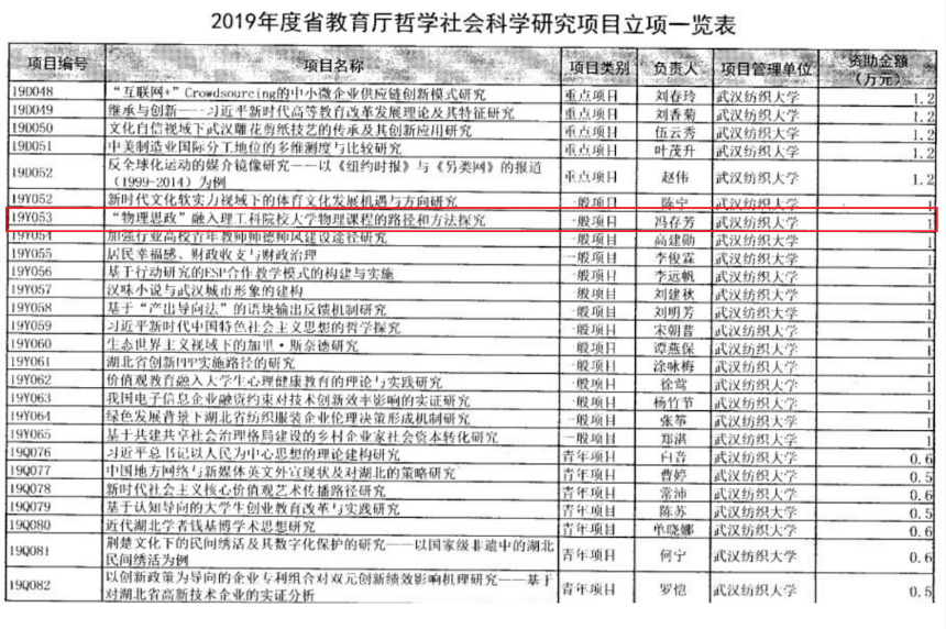 近日,根据湖北省教育厅办公室下达的《关于2019年度省教育厅哲学社会科学研究项目立项的通知》(鄂教思政办函〔2019〕4号)文件,我院大学物理课程思政团队冯存芳老师主持的项目《“物理思政”融入理工科院校大学物理课程的路径和方法探究》经专家评审,喜获省教育厅哲学社会科学一般项目。
