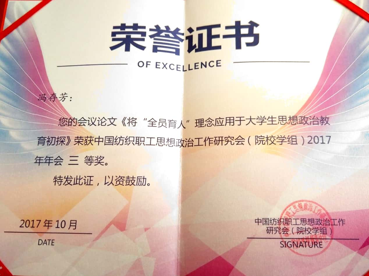 上一条:我院教师荣获2018年中纺职工思政年会二等奖 下一条:我院完成“学科教学育人与课程思政”专题网络培训