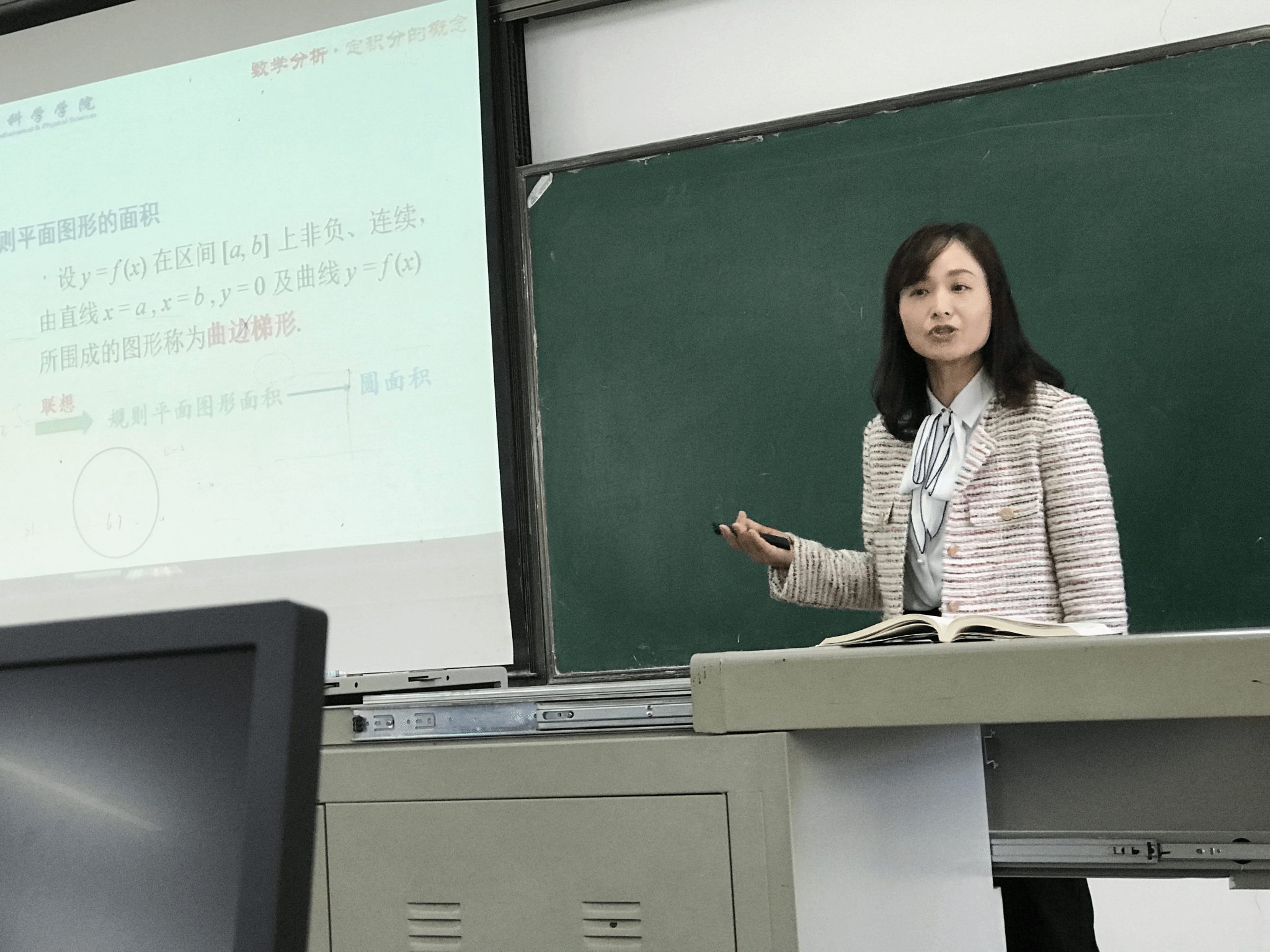 董敏老师讲授的课程是《数学分析II》,讲授的主题是“定积分的概念”。董敏老师精心准备了此次观摩课。她运用图文并茂、辅助动画演示的多媒体课件,将抽象的数学概念,生动形象的向学生讲述了出来。课堂气氛活跃,极大提高了学生的学习兴趣。