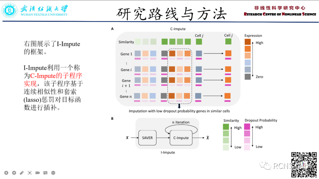 韩长锋:在本次汇报中分享了一篇名为《I-Impute:a self-consistent method to impute single cell RNA sequencing data》的文章,本文对插补一致性提出了一种新的解释。作为一个可靠的插补工具,应该假设其输出不包含丢失或错误。希望插补工具的输出是一致的:如果我们删除一些条目之后再次将插补后的输出提供给插补工具,那么该工具应该能够再现这些条目。我们把这种特性称为自洽(self-consistency)。