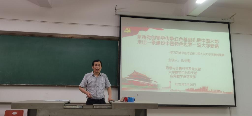 信息与计算科学系党支部、应用数学系党支部和大数中心党支部在四号楼105室开展了“坚持党的领导、传承红色基因、扎根中国大地、走出一条建设中国特色、世界一流大学新路”的主题党日活动。信息与计算科学系党支部书记仇华海主持并领学,韦德bet