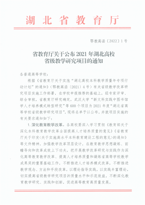 此次省教育厅在学校申报推荐的基础上,经专家评审、综合审核、研究后确定,武汉大学"新文科实践中图书馆学人才培养模式转型研究"等600个项目为2021年度"湖北省高等学校省级教学研究项目"。